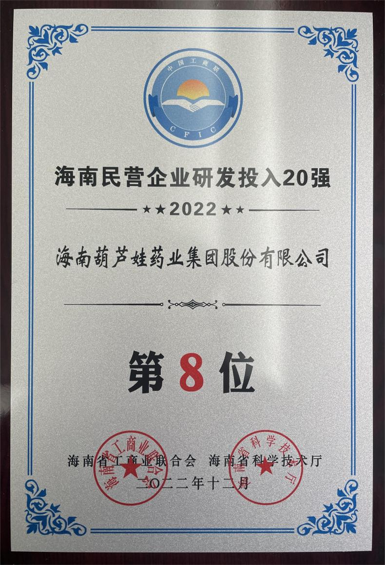 12月23日,2022海南民营企业50强和研发投入20强发布会在海口举行。会上发布了“2022海南民营企业50强”“2022海南民营企业研发投入20强”榜单和分析报告。九游会药业再次荣登两榜,在海南民营企业50强榜单中位列第25位,较去年上升8位,这也是公司连续三年登榜;在海南民营企业研发投入20强中位列第8位,较去年上升7位。